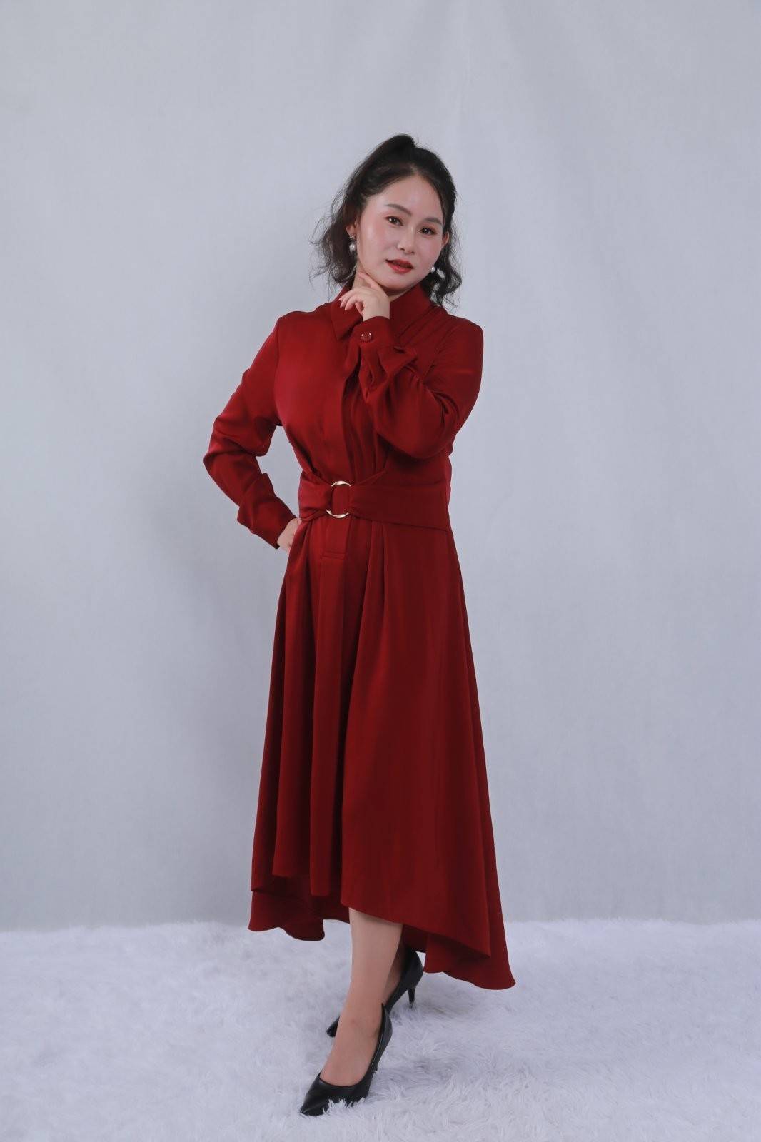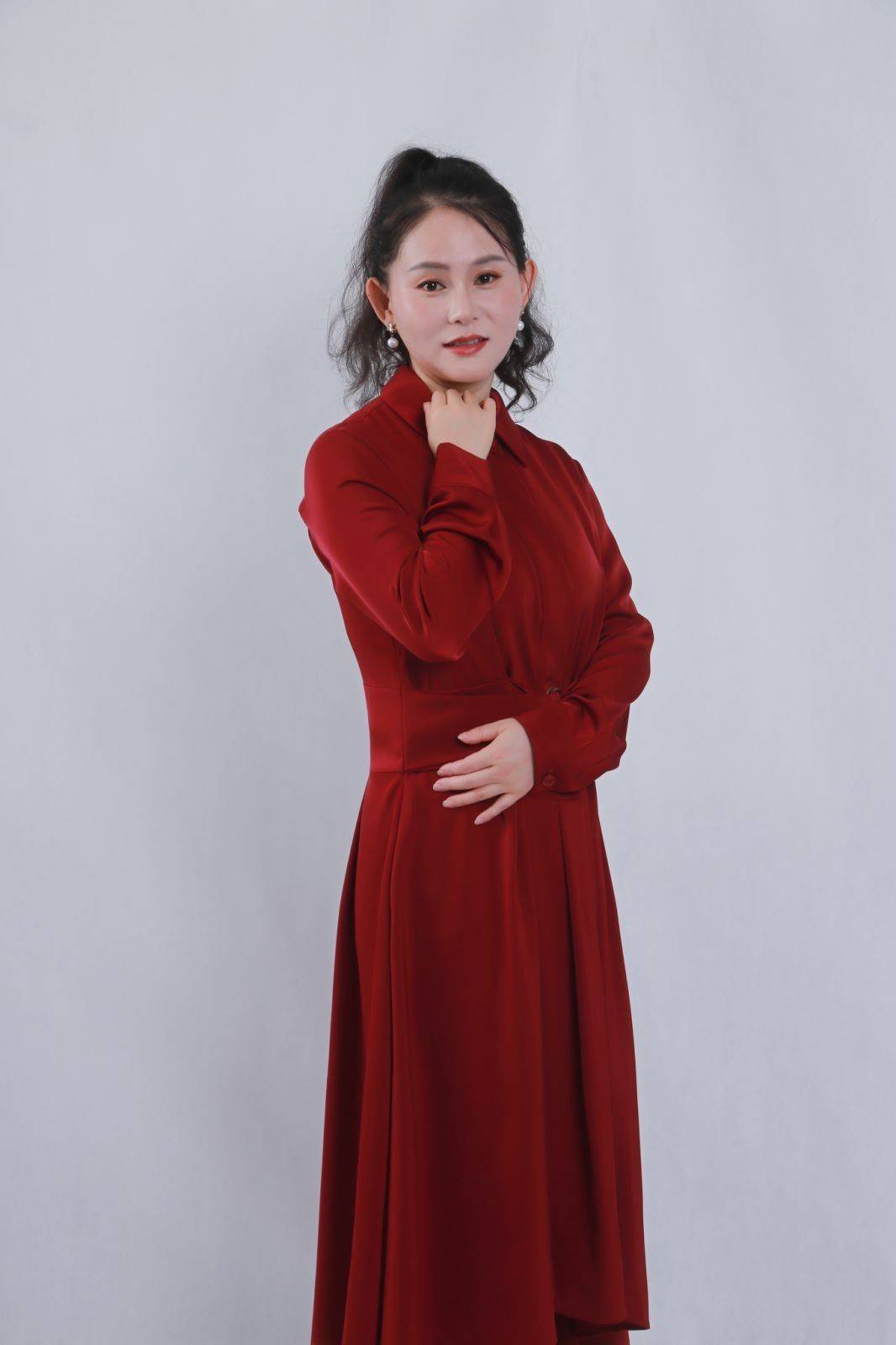 酒红色丝缎长裙是她的复古情书。衬衫领的知性、收腰设计的曼妙、不规则裙摆的灵动,再搭配一支红玫瑰,她化身复古画报里的女郎。丝缎的光泽感在灯光下流转,衬得肌肤愈发细腻,长裙的长度与廓形完全服务于 “风情表达”—— 前短后长的裙摆设计,行走间露出脚踝的纤细,让复古风多了几分现代的轻盈。她用这套穿搭打破 “小个穿长裙拖沓” 的偏见,以风格为笔,在时尚画布上绘出独属于小个模特的复古风情。