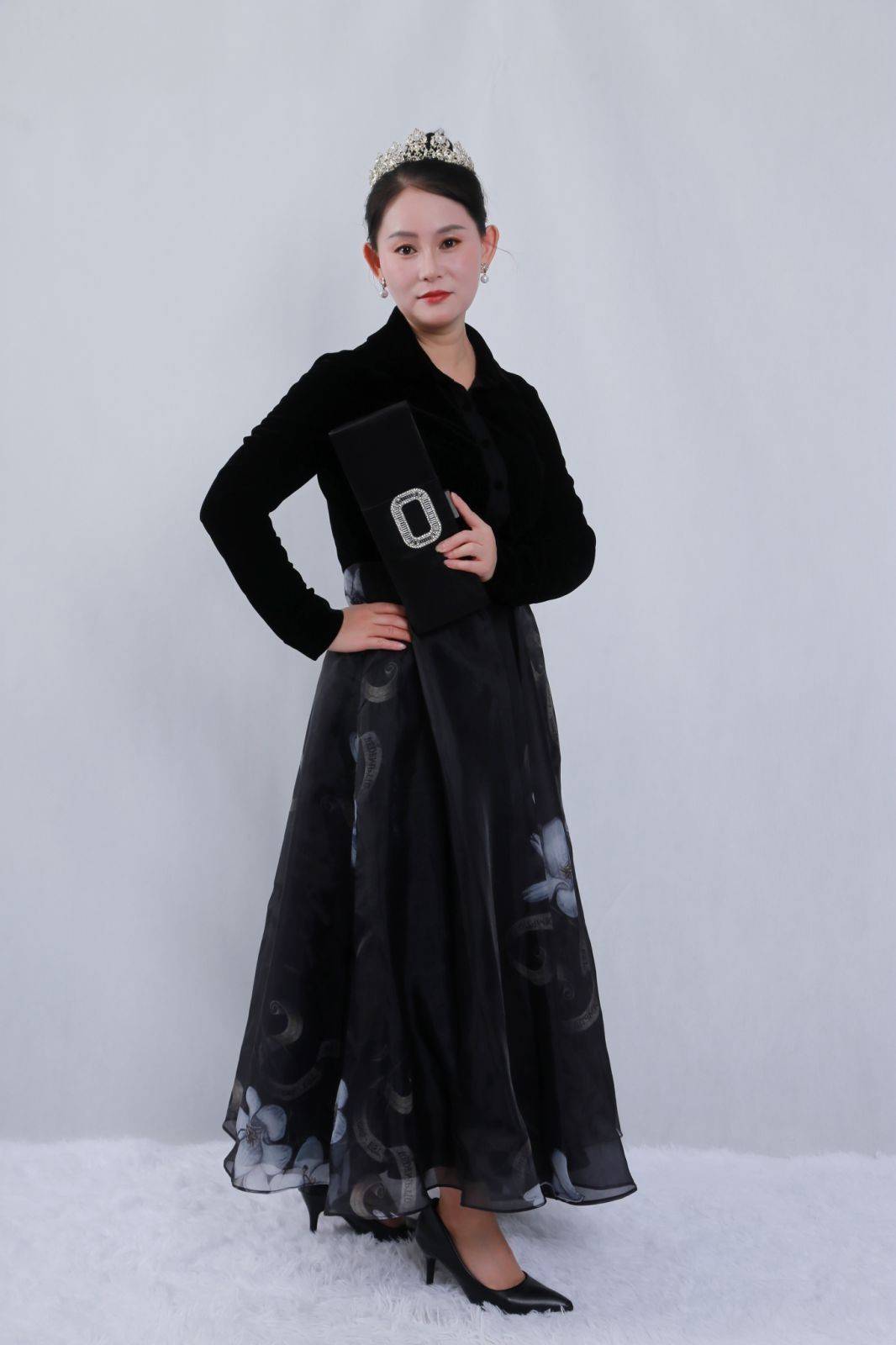 当丝绒的醇厚遇上欧根纱的飘逸,程燕龙将 “晚宴优雅” 诠释得淋漓尽致。黑色丝绒上衣的复古质感,与印花欧根纱长裙的浪漫廓形碰撞,搭配镶钻手包与闪耀王冠,她是宴会厅里的焦点 —— 丝绒的垂坠感勾勒出利落肩线,欧根纱的层叠裙摆随姿态轻扬,每一步都踩着自信的鼓点。这份优雅无关身高,全在对材质与廓形的精准驾驭,将 “小个模特” 的气场拉满,证明精致感从不是高个子的专属。